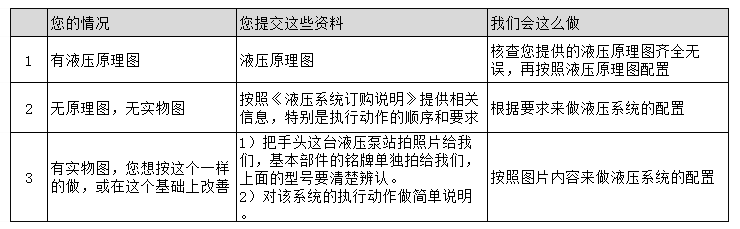 做一臺液壓系統(tǒng)需要客戶提供液壓要達(dá)到什么樣的功能要求。液壓系統(tǒng)的整個工作過程。比如一共有幾個油缸或馬達(dá),每個油缸需要達(dá)到多少推力,每個油缸的速度是多少是否有變化,以及每個油缸的負(fù)載情況。多個油缸時,是否有同時工作或同步要求。(是否變化、還需要提供工作時間、工作環(huán)境)